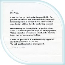 | “I used the free eye checkup facility provided by Dr. Priya for my mother who was complaining constantly for running water in her eyes and was also worried as some doctors told her that she was having cataract. |